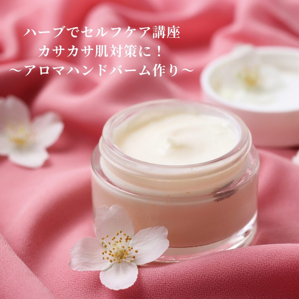 「ハーブでセルフケア講座」 カサカサ肌対策! サラリと馴染むハンドバーム作り。 冬の間は乾燥しやすい時期となりますが、乾燥のピークとされているのは1月・2月。 この講座では、ハンドバームの作り方や、カサカサ肌に役立つエッセンシャルオイルの紹介を学べます。 ベトつき感がなく日中にも心地よく使える、自分だけのハンドバームを作りましよう! 身体に優しいハーブティー付きです。